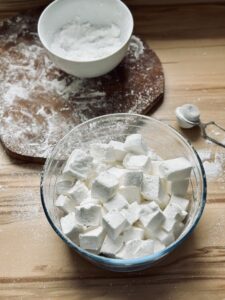 - Den Teig in 8 Portionen teilen, zu 1 cm Rollen formen und in ca. 1,5-2 cm große Stücke schneiden.